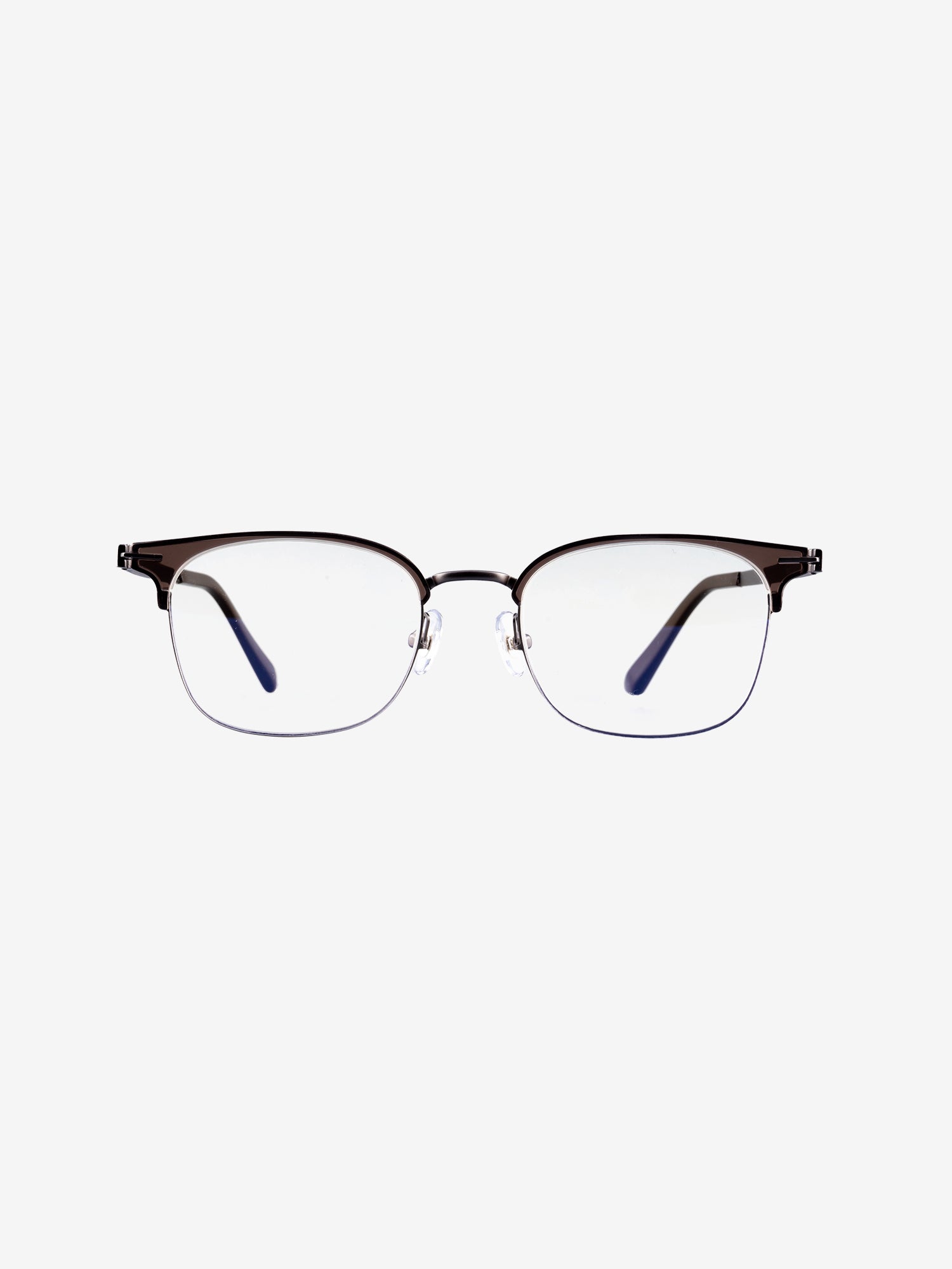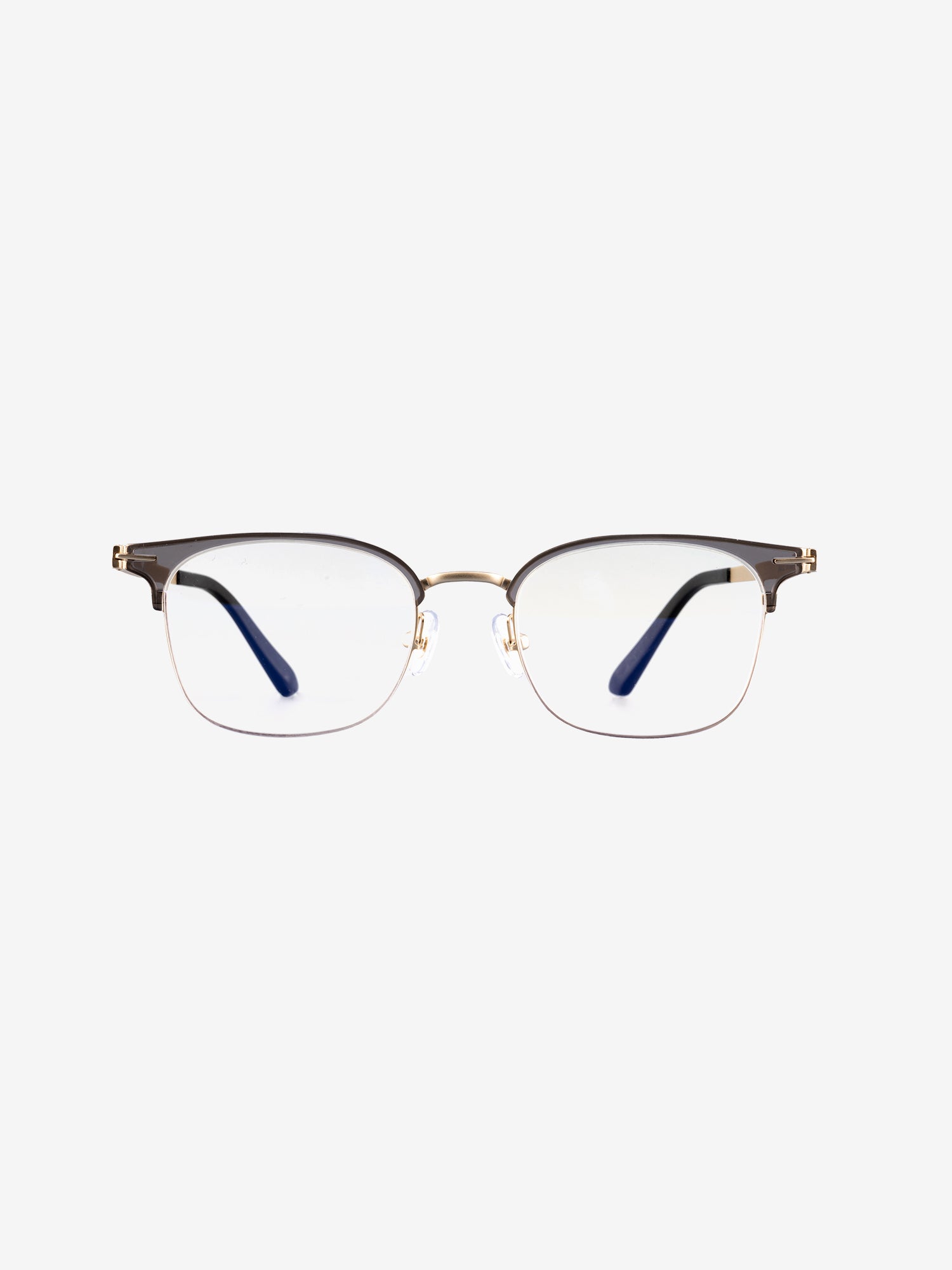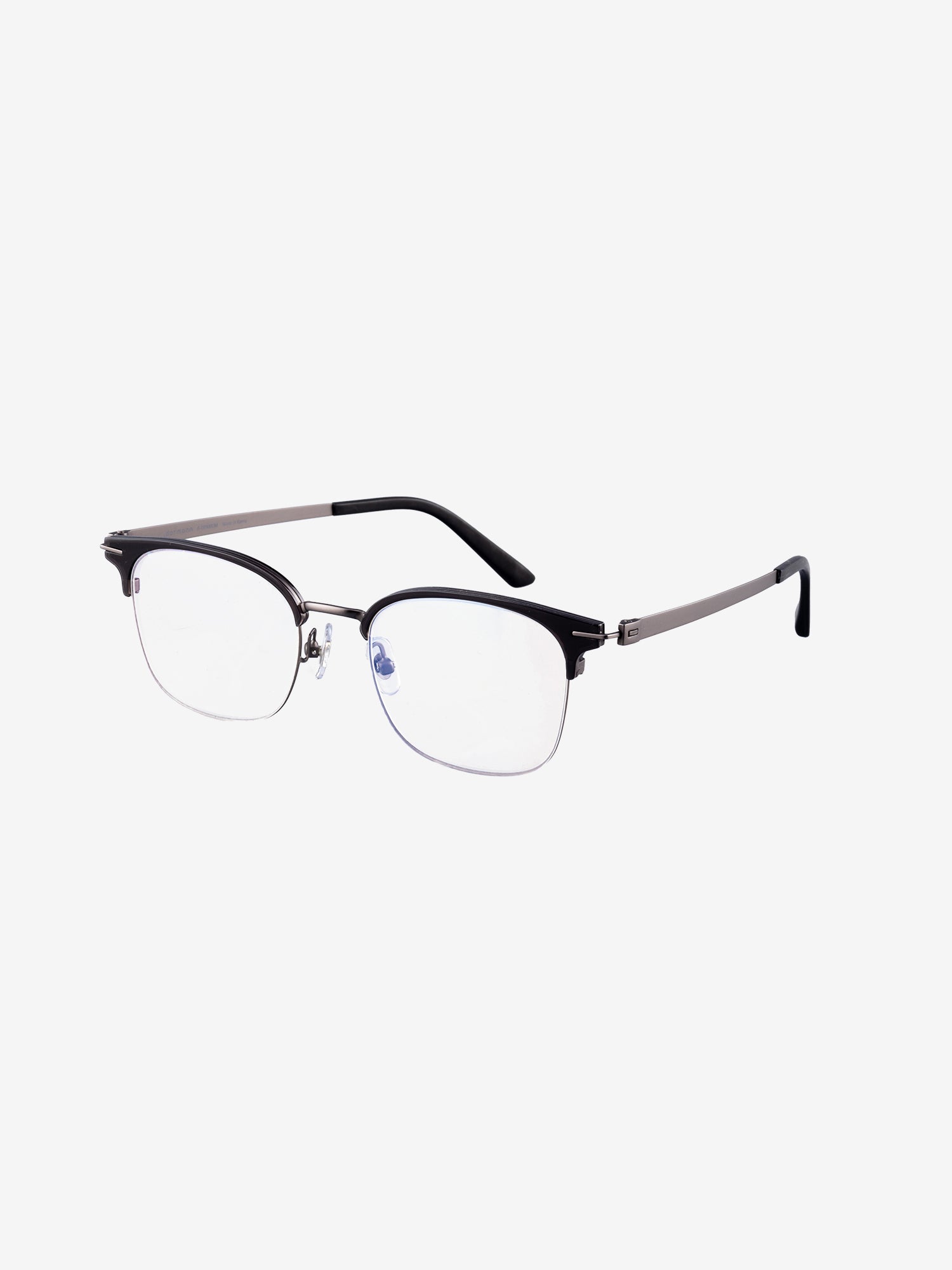 Browline style frames in a combination of metal and transparent TR90 with rectangular lenses and beta titanium temples.