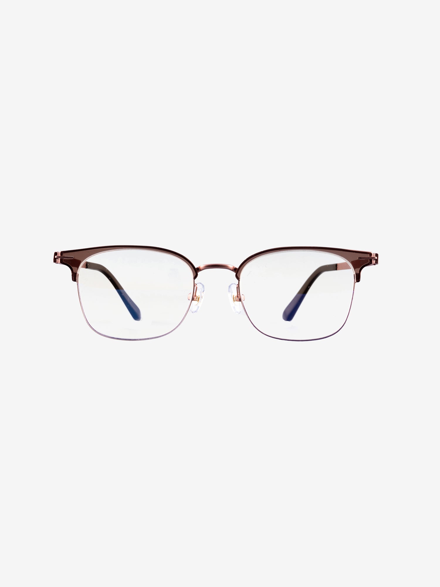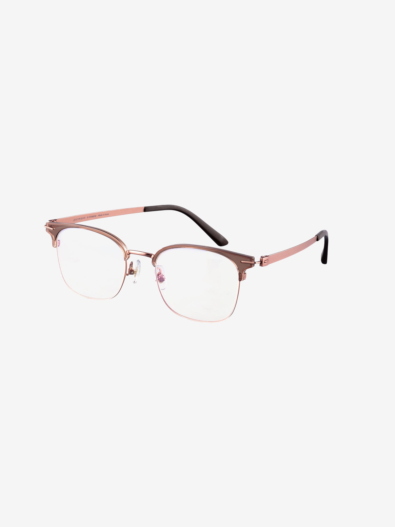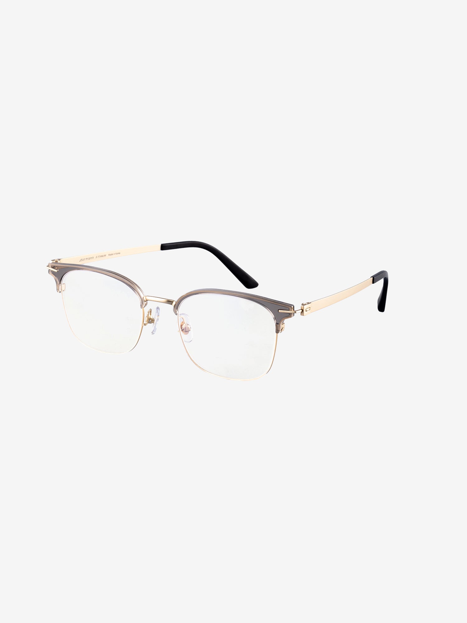 Browline style frames in a combination of metal and transparent TR90 with rectangular lenses and beta titanium temples.